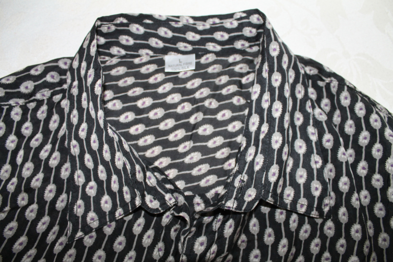 Mooie stippen gestreepte print zwarte blouse van 100 % natural fibre silk, soepel, zacht, heel fijn en licht gewicht, comfortabel dragen. Hij heeft een kraagje en aan de voorkant zitten zes knopjes