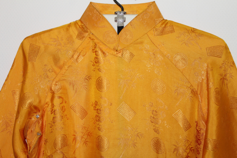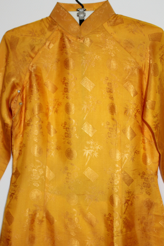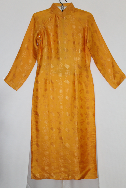 Maak een onvergetelijke indruk met deze schitterende, handgemaakte Áo Dài in een levendige oranje kleur. Deze traditionele Vietnamese jurk is een meesterwerk van vakmanschap, rechtstreeks vervaardigd door gespecialiseerde kledingmakers in Vietnam. De combinatie van symbolische prints en de luxe witte satijnen broek zorgt voor een koninklijke uitstraling.