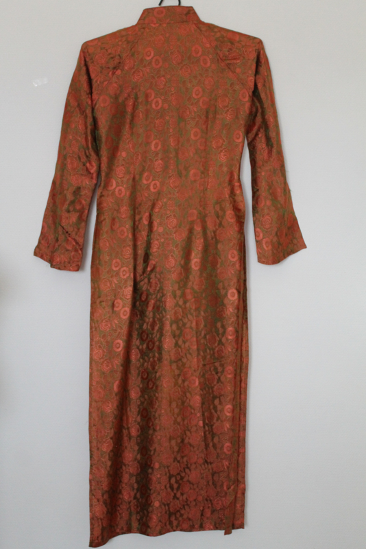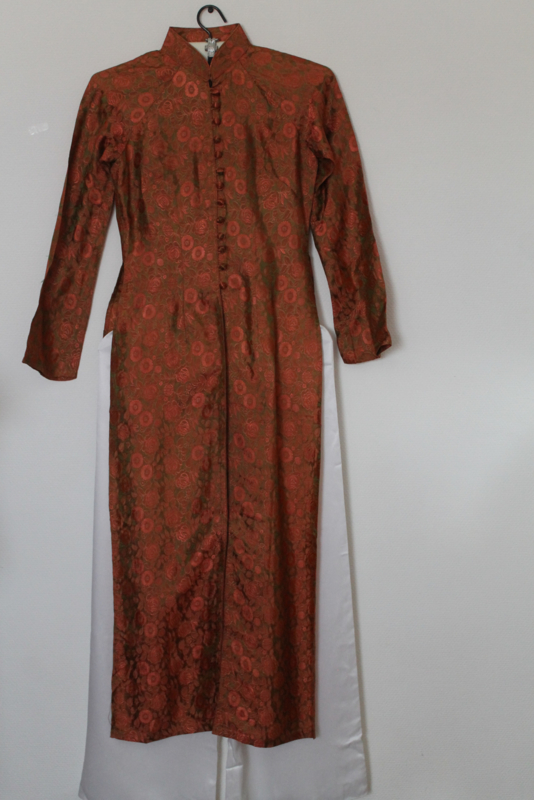 Ontdek de charme van deze unieke, handgemaakte Áo Dài in een warme rode kleur. Wat dit model bijzonder maakt, is de authentieke voorsluiting, een klassiek ontwerp dat zelden nog in deze kwaliteit te vinden is. Deze jurk is met uiterste precisie vervaardigd door een gespecialiseerde kledingmaker in Vietnam.
