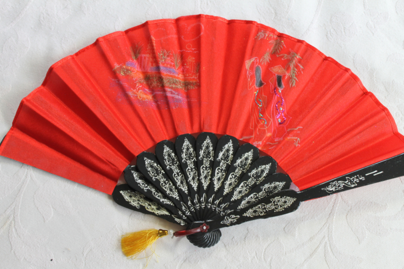 Mooie rode handwaaierVietnamese waaier van stof met handgeschilderde de landschappen in Vietnam