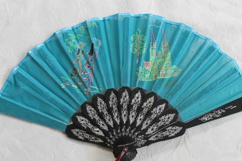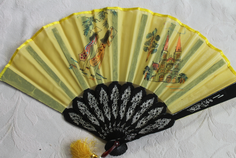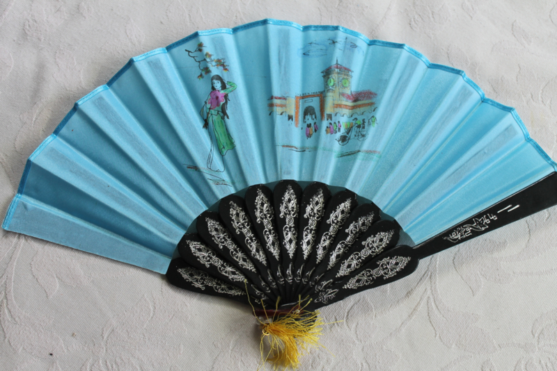 Licht blauw handwaaierVietnamese waaier met verschillende bedrukte figuur in Vietnamese traditioneel kleding, bamboe, takken boom, Benthanh markt