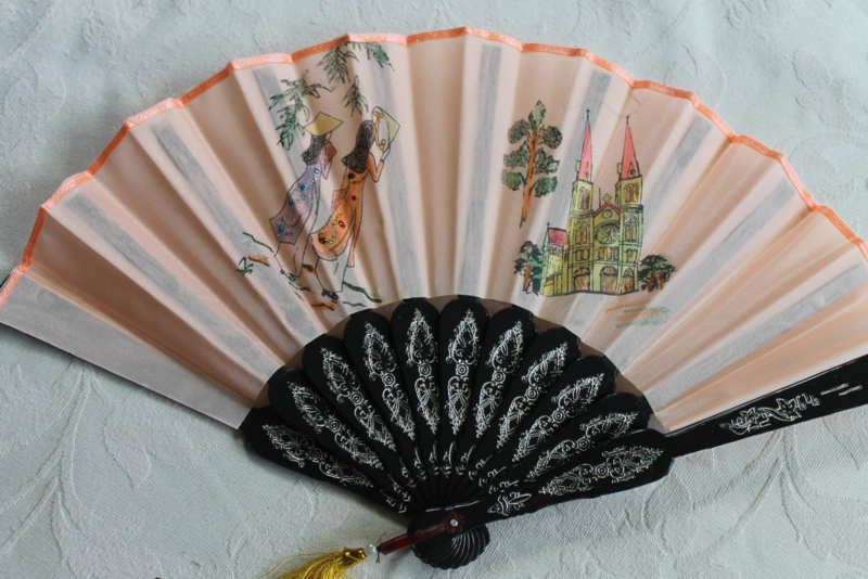 Mooie licht oranje handwaaierVietnamese waaier van stof met handgeschilderde de landschappen in Vietnam